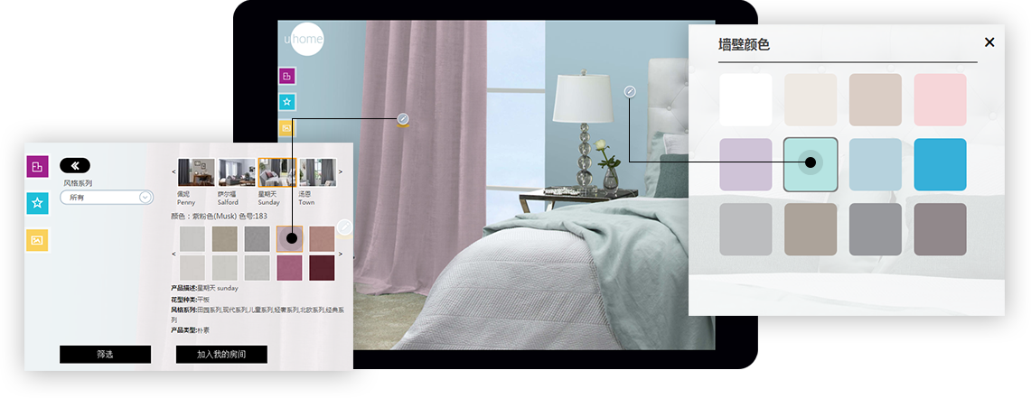 在線選擇不同的家居位置搭配不同顏色風格的窗簾,隨心打造您自己的專屬房間,在線就能感受到家的舒適、