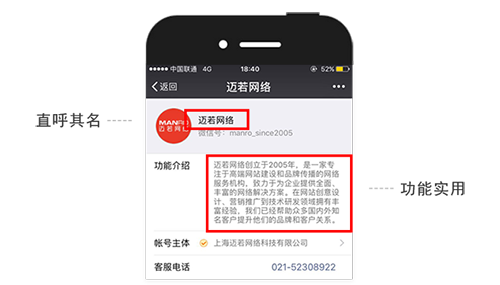直接以企業(yè)名稱或者產(chǎn)品名稱作為微信公眾號的名稱,有利于用戶直接搜索關(guān)注。