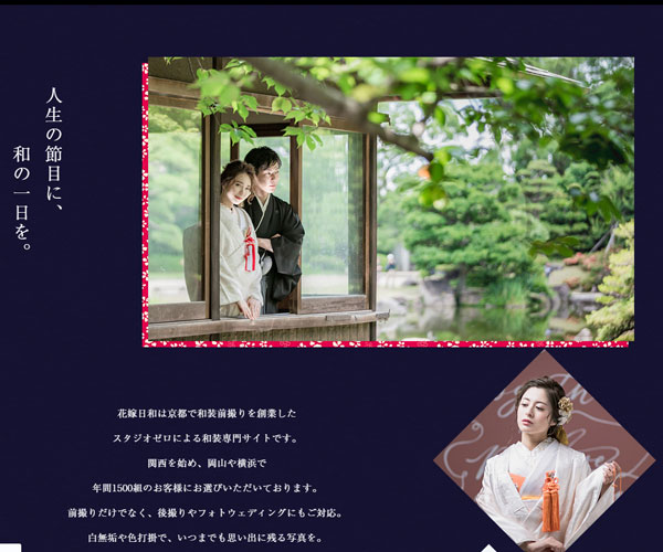 Wasoumaedori一家提供日式和服婚紗以及拍攝的公司,網(wǎng)站的整體用色創(chuàng)新大膽,一眼就讓人