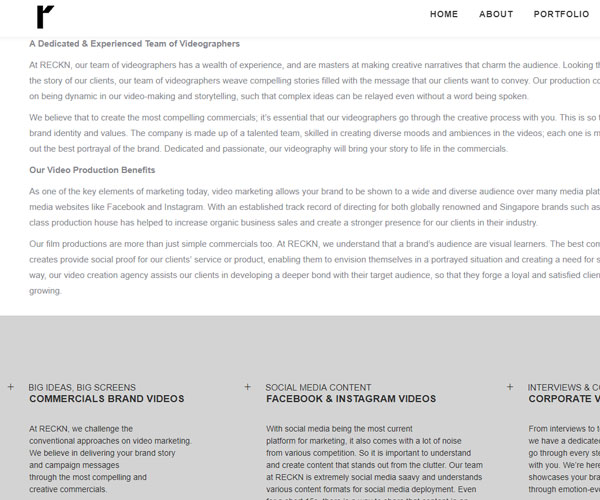 Recknstudios制作精美的數(shù)字影像,官網(wǎng)通過(guò)文字與圖片視頻的側(cè)重點(diǎn)不同形成對(duì)比
